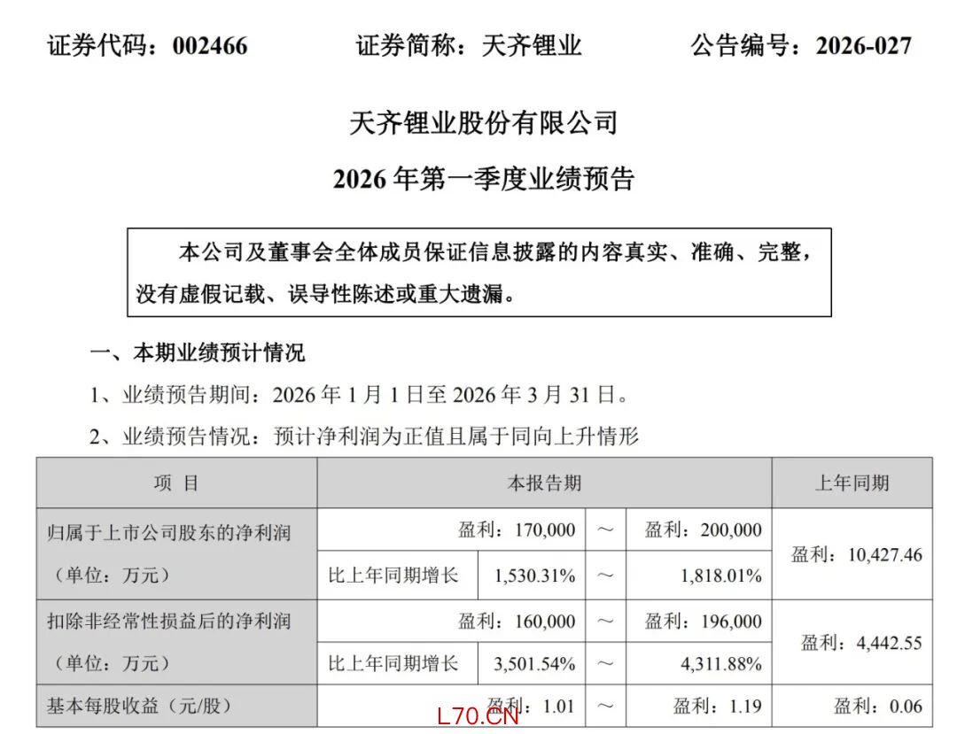 千亿锂矿龙头天齐锂业,净利预增1800%