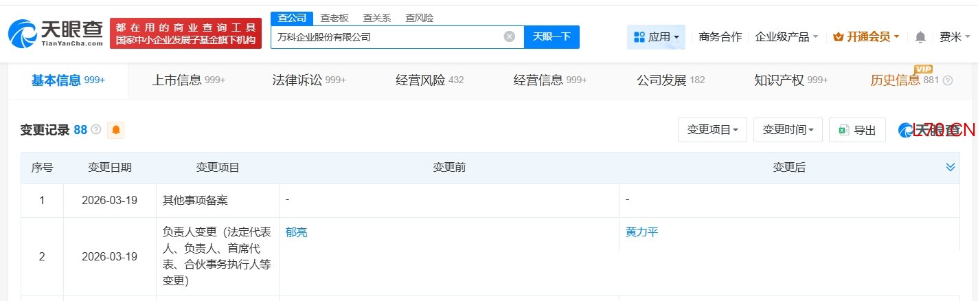 天眼查App显示,近日,万科企业股份有限公司(以下简称“万科A”,000002. SZ)发生工商变更,郁亮卸任法定代表人,由黄力平接任。