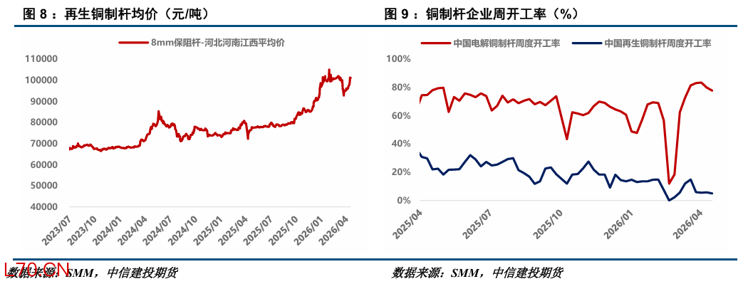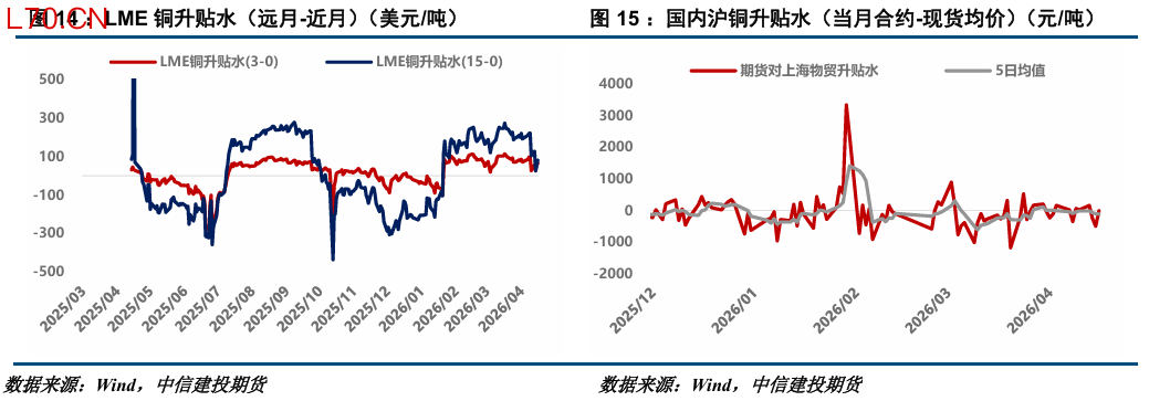 供应压力加剧,基本面支撑强化。供应端,中国宣布自5月起禁止电子级硫酸以外的硫酸出口,对南美、非洲以来硫酸浸出萃取的湿法铜生产形成限制,据SMM交叉验证,刚果主要铜钴生产商因收到部分关键浸出硫酸等化学品订单已取消或供应商撤回,被迫削减矿产产量。需求端,铜价进一步上行,下游企业普遍持观望态度,采购趋于谨慎。库存方面,本周全球铜库存继续去化1.44万吨至约121.3万吨,其中境内铜库存持续减少2.74万吨至27.5万吨,LME铜库存小幅累库0.75万吨至40万吨,COMEX铜库存亦小幅累库0.55万吨至53.75万吨,此外SMM中国铜主要社会库在本周延续去库约1.7万吨至28.2万吨。