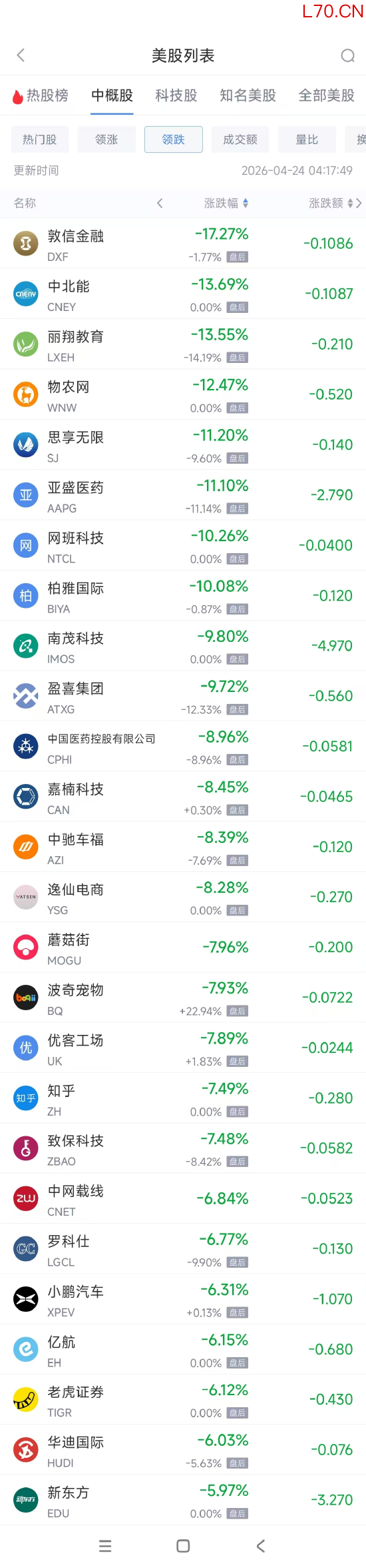 领跌中概股列表:
