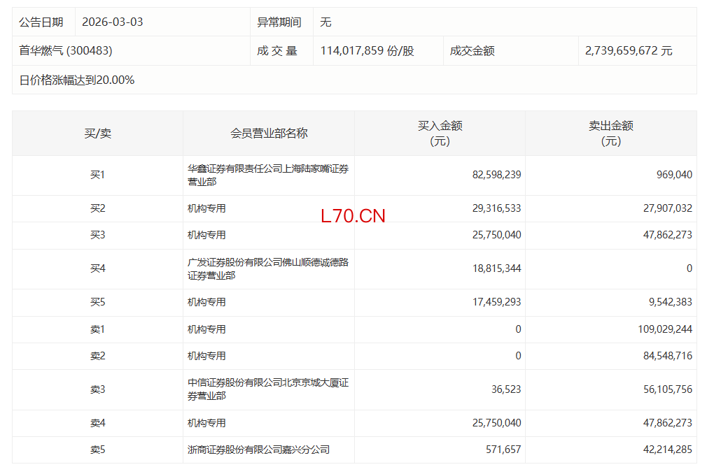 首华燃气今日20%涨停,有3家机构专用席位净卖出2.16亿元