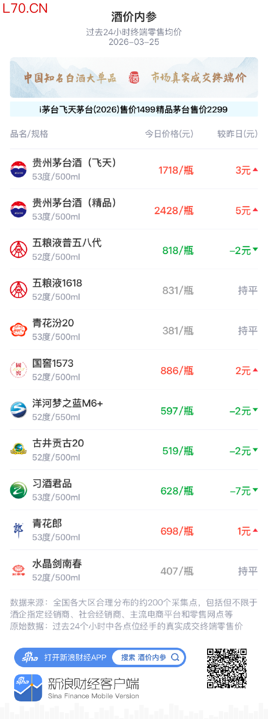 新浪财经“酒价内参”过去24小时收集的数据显示,中国白酒市场主要单品的终端零售均价在3月25日整体窄幅波动。如果11大单品各取一瓶打包售卖,今日总售价为9911元,较昨日下跌2元。市场整体表现平稳,部分高端单品价格延续上行,个别中腰部产品报价有所回落。