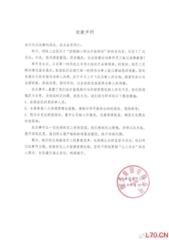 得力就辞退跛脚员工致歉