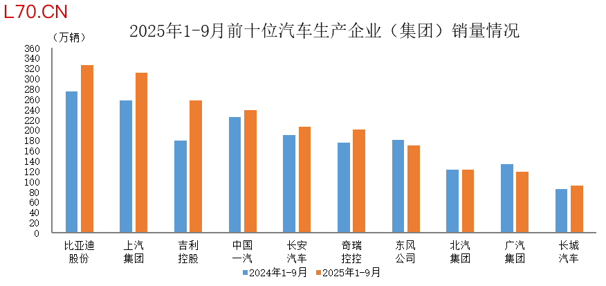 1-9月汽车销量排名前十位的企业(集团)共销售2043.1万辆