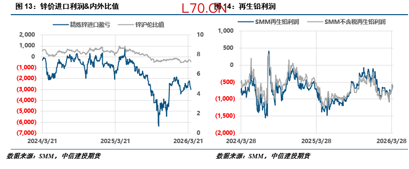 原生铅方面,国产矿TC涨至300元/吨,进口矿TC持稳-135美元/吨;白银收益环比回升。再生铅方面,铅价回升,再生亏损修复,截止4月17日,SMM再生铅冶炼利润收于-684元/吨。